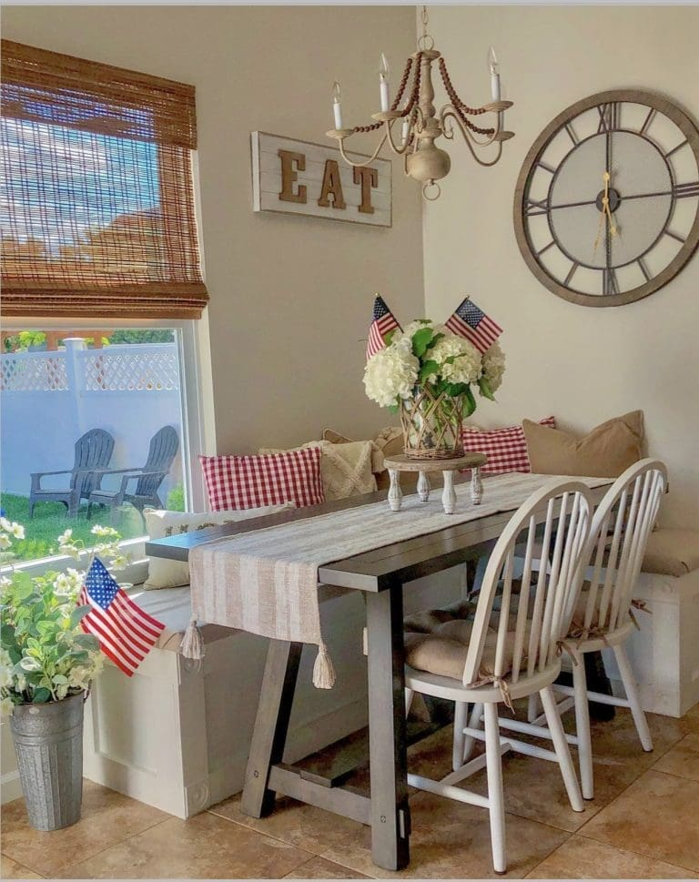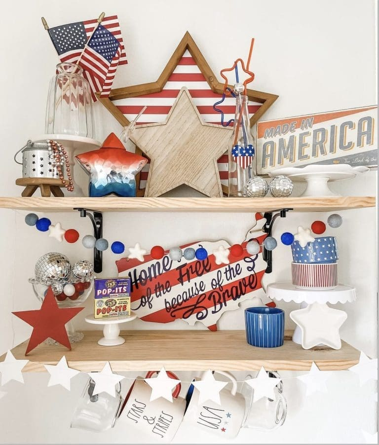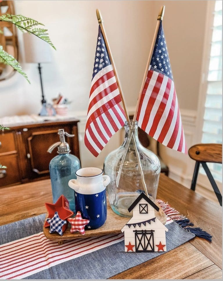 Placing small flags in a clear glass container is a simple yet effective decorative idea. This arrangement works well as a centerpiece or accent piece in various areas of your home. The transparent container keeps the focus on the flags while adding a clean and modern touch. It’s an easy way to incorporate patriotic elements without overwhelming your décor. This idea is both practical and visually appealing, making it a popular choice for many households.