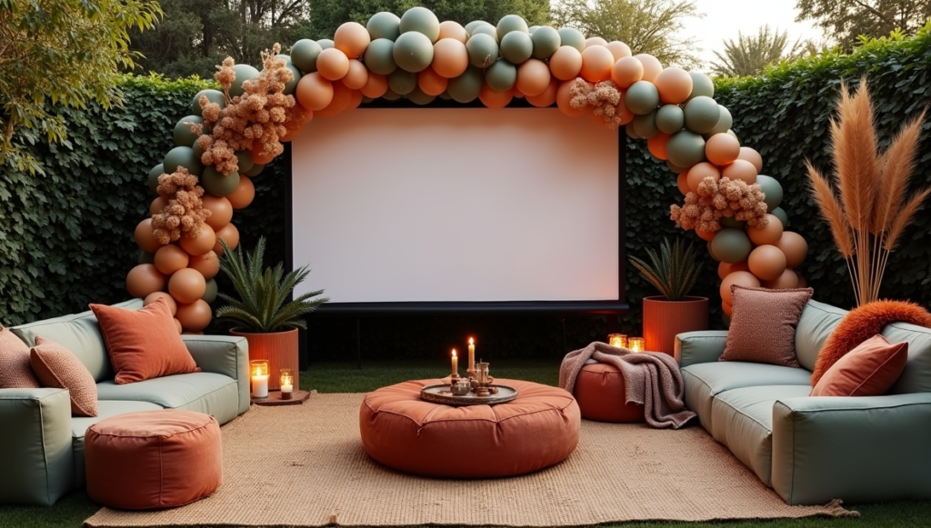 Create a cozy yet visually striking outdoor cinema lounge using earthy bohemian tones and layered textures. Start by placing a freestanding 100-inch projector screen against a natural backdrop like trees or hedges to define the viewing area. Surround the screen with a balloon arch in muted sage and rust tones, enhanced with dried pampas grass for a natural finish. Cover the ground with layered jute and woven rugs to keep guests comfortable. Add plush seating such as velvet poufs and leather cushions, along with warm lighting and small tables for snacks to complete the relaxed atmosphere.