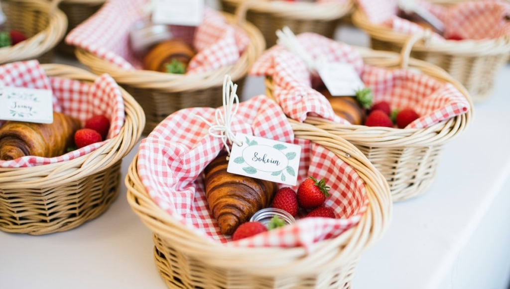 Upgrade your morning event setup with charming individual breakfast baskets instead of a traditional buffet. Use small wicker baskets as the base and line them with soft gingham fabric for a classic touch. Fill each basket with simple yet fresh items like croissants, berries, and a small jar of jam. This approach not only looks organized but also makes serving easier for guests. Personalized tags tied to each basket can add a thoughtful detail, making the experience feel more special and well-prepared.