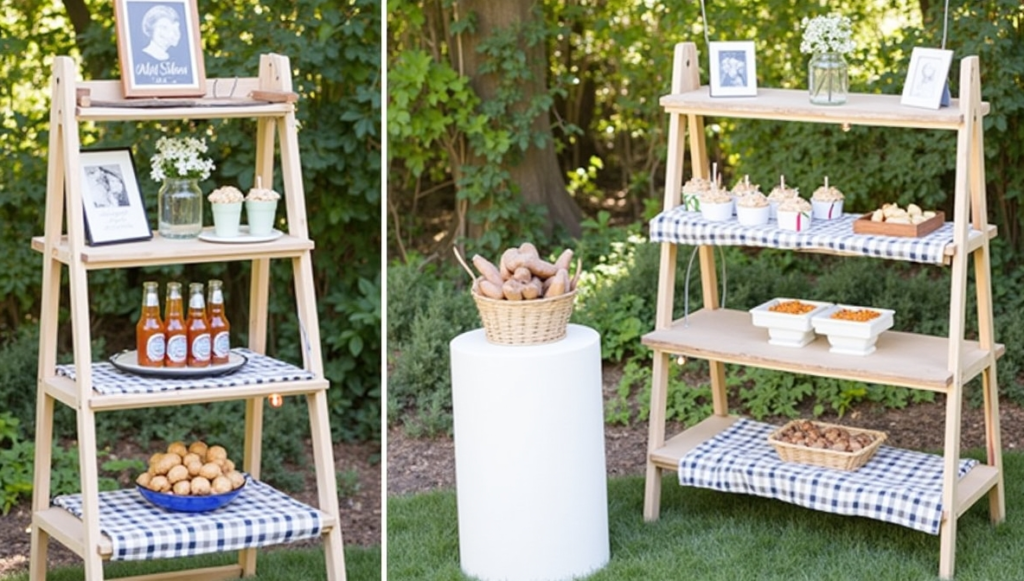 A wooden ladder can be transformed into a creative serving station for outdoor gatherings. Choose a sturdy A-frame ladder and add fabric layers such as burlap or gingham to create stable surfaces for food and drinks. Arrange items like mason jar beverages, snacks, and desserts across the shelves for easy access. Decorative elements such as framed photos or small lights can enhance the overall look. This setup combines practicality with rustic charm, making it ideal for casual outdoor celebrations.