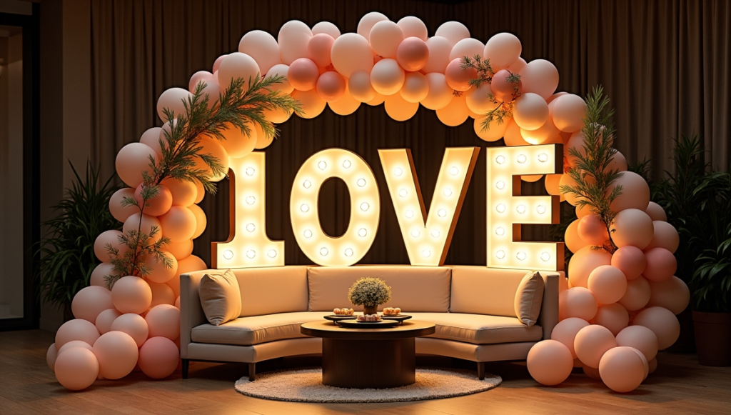 Make a bold statement by incorporating illuminated marquee letters into your event design. Arrange large letters to highlight the occasion and pair them with a coordinated balloon arch in complementary colors. Adding greenery or soft florals can create a balanced and polished appearance. Position a low table in front for food or decor, and surround it with comfortable seating options. This focal point not only enhances the visual appeal but also serves as a perfect backdrop for photos.