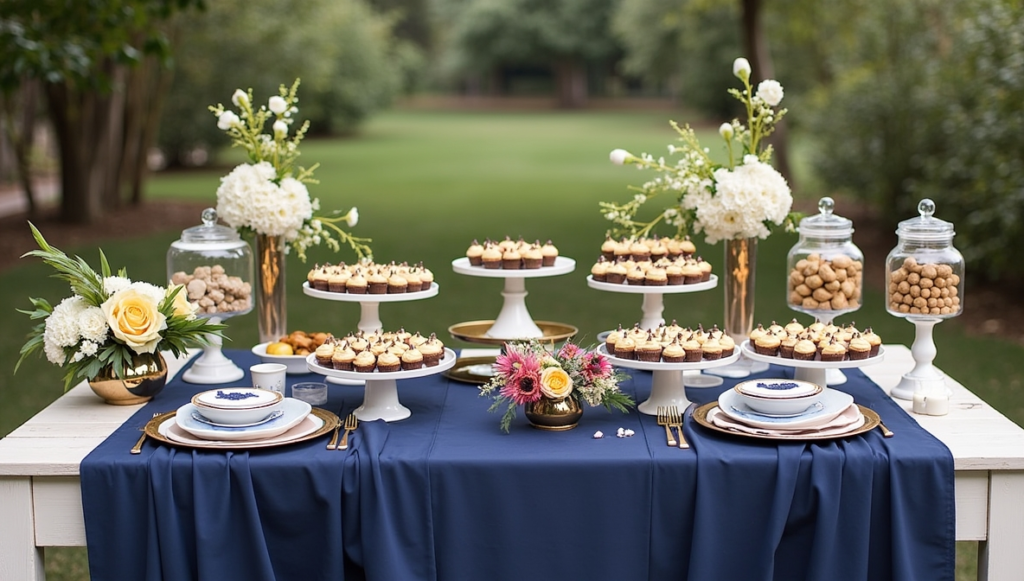 Create a refined dessert table using a navy and gold color scheme for a timeless look. Start with a sturdy table and layer it with a flowing fabric runner to add movement. Use elevated stands to display desserts at different heights, making the setup more dynamic. Decorative jars filled with themed treats can add both color and structure. Incorporate fresh flowers or simple arrangements to soften the design. Proper lighting above the table ensures it remains visually appealing even as the evening progresses.