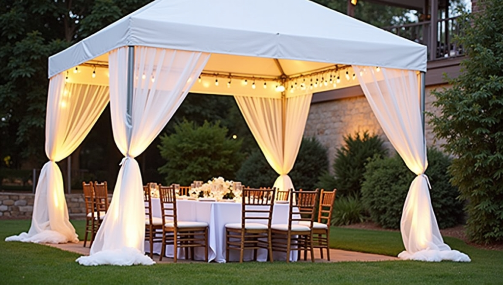 For a more polished outdoor event, consider setting up a pavilion with soft, flowing fabric. Sheer drapes can be arranged across the structure to create an elegant canopy effect. Add warm lighting between the fabric layers to maintain a welcoming ambiance after sunset. Use coordinated table settings and comfortable chairs to complete the look. This setup provides both style and practicality, offering protection from weather while maintaining a sophisticated atmosphere for guests.