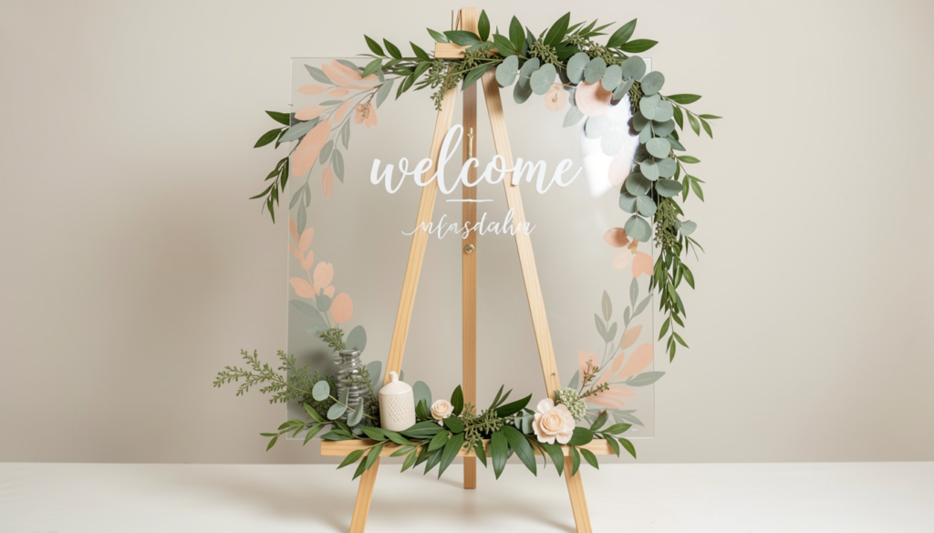 Welcome guests with a beautifully designed acrylic sign displayed on a sturdy easel. Choose soft color accents such as sage and peach to create a gentle and inviting aesthetic. Enhance the display with a balloon arrangement or greenery for added dimension. Placing small decorative items at the base, like potted plants or themed accents, can help ground the setup. This feature serves as both a greeting point and a decorative highlight for your event.