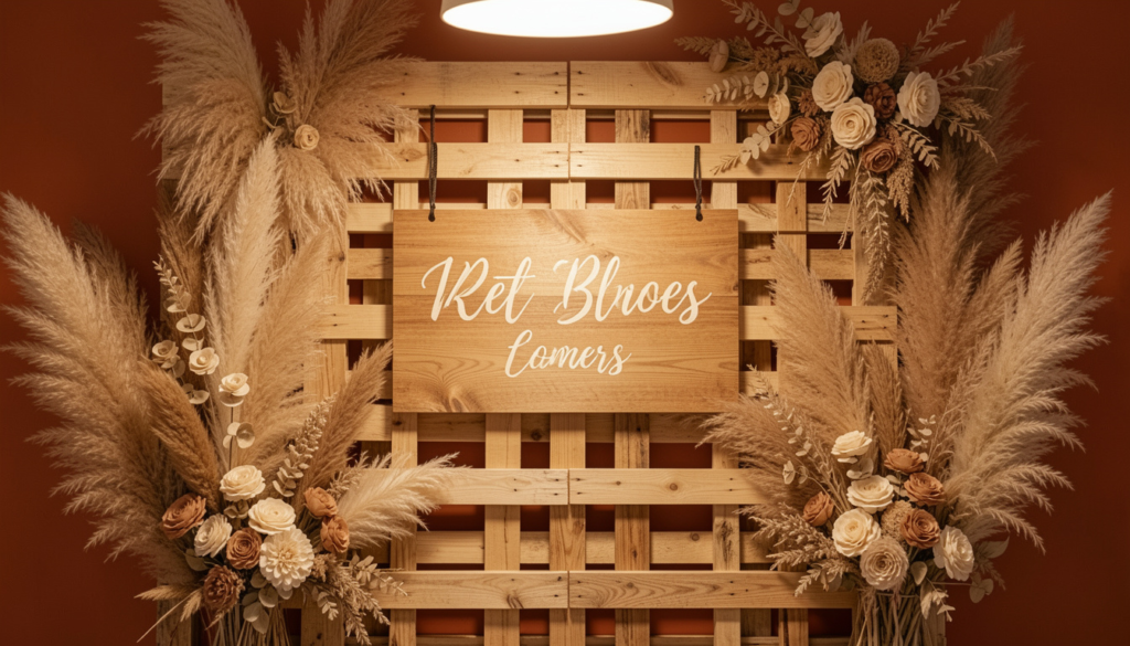 Build a warm and earthy backdrop using natural wood elements and terracotta tones. A sturdy wooden panel or pallet wall can serve as the base, providing stability and texture. Add a central sign or focal piece to personalize the display. Incorporate dried plants or neutral-colored florals to create depth and visual interest. Soft lighting above the backdrop can enhance the overall effect, making it suitable for photos and gatherings throughout the event.