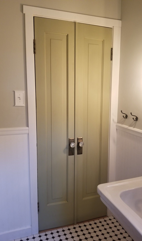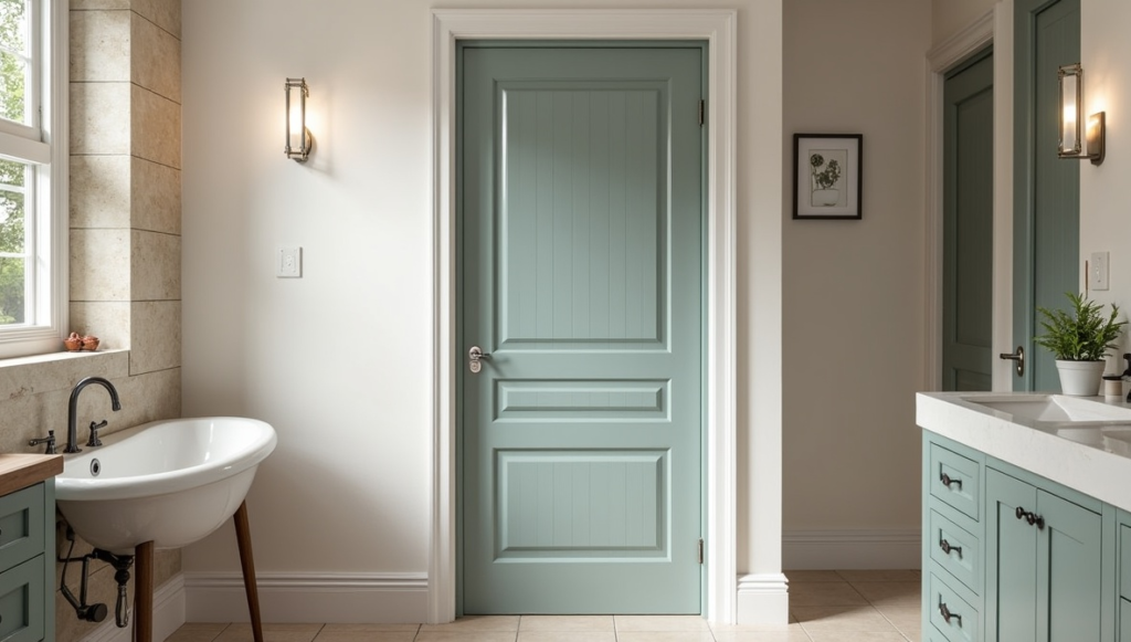 Olive-colored bathroom doors provide a unique, organic touch to any space. Subtle green tones introduce warmth and personality without overwhelming the room. This option pairs beautifully with wood accents, white walls, or natural stone tiles, adding depth and visual interest. Olive doors work well in both modern and rustic designs, creating a cohesive look while offering durability and functionality. Choosing this shade adds character to your bathroom while remaining versatile and timeless, making it a distinctive and appealing design choice.