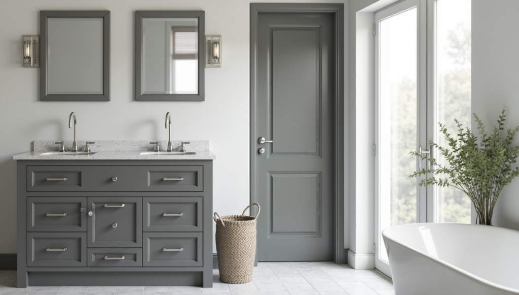 Gray bathroom doors offer understated sophistication and versatility. From soft dove gray to deep charcoal, these doors complement modern, minimalist, or transitional interiors. The neutral tone enhances other design elements, such as flooring, cabinetry, and lighting. Gray doors provide a refined backdrop while maintaining durability and ease of maintenance. This choice creates a polished, cohesive aesthetic, making your bathroom feel calm, elegant, and thoughtfully designed, while remaining timeless and adaptable for future decor updates.