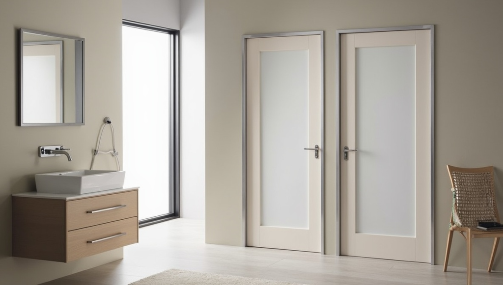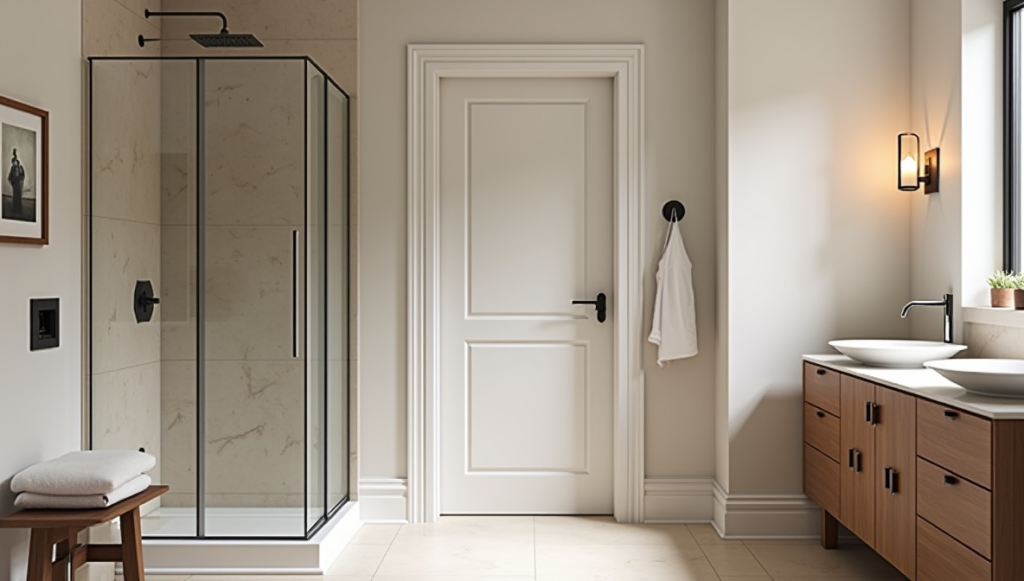 Robust bathroom doors offer durability and a strong visual presence. Thick panels, solid construction, and high-quality finishes create a sense of stability and sophistication. These doors are ideal for high-traffic bathrooms or homes that require long-lasting functionality. They pair well with modern or traditional interiors, balancing aesthetic appeal with practicality. A robust door ensures longevity while enhancing the room’s overall style, making it both a functional and visually striking choice that stands out for its quality and reliability.