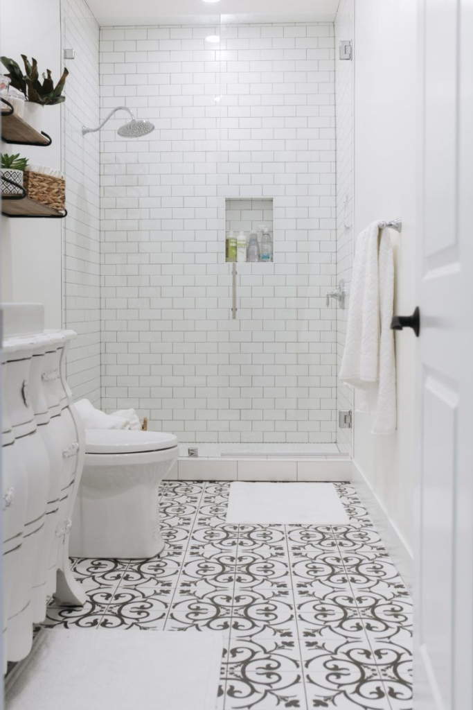 Patterned bathroom flooring adds depth and personality to a minimalist layout. From Moroccan-inspired motifs to geometric tile arrangements, patterns create visual texture and interest. When done thoughtfully, these designs maintain balance while offering a striking focal point. Subtle color combinations ensure the pattern complements rather than overwhelms the space. Patterned floors work beautifully in powder rooms, guest bathrooms, or feature areas, giving a unique touch while still adhering to a minimalist aesthetic. They blend creativity with functionality, offering a floor that is both stylish and practical.