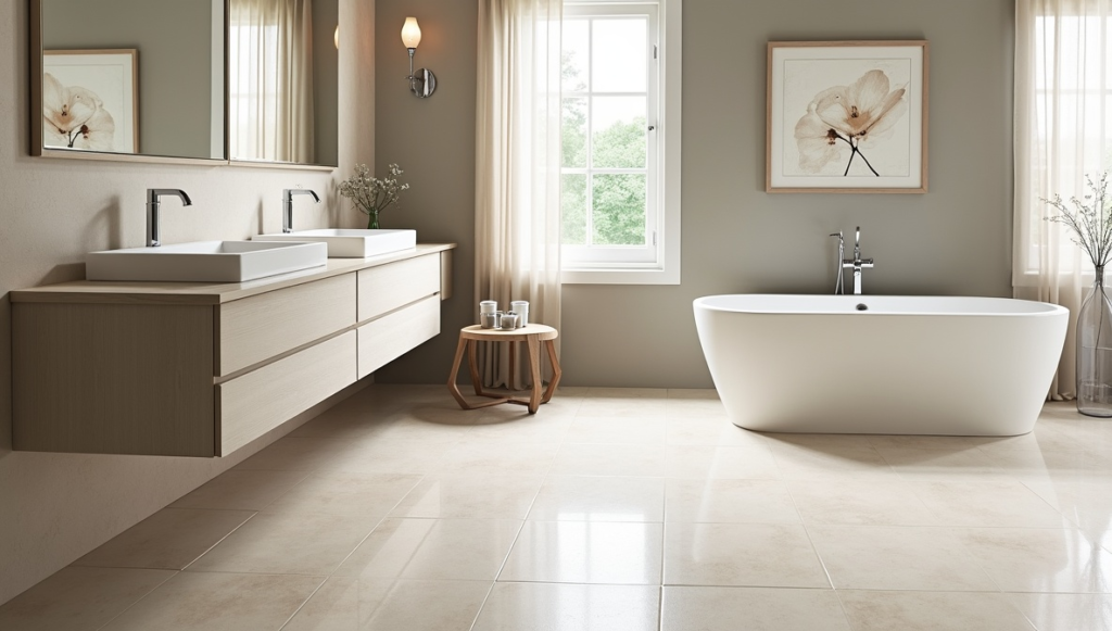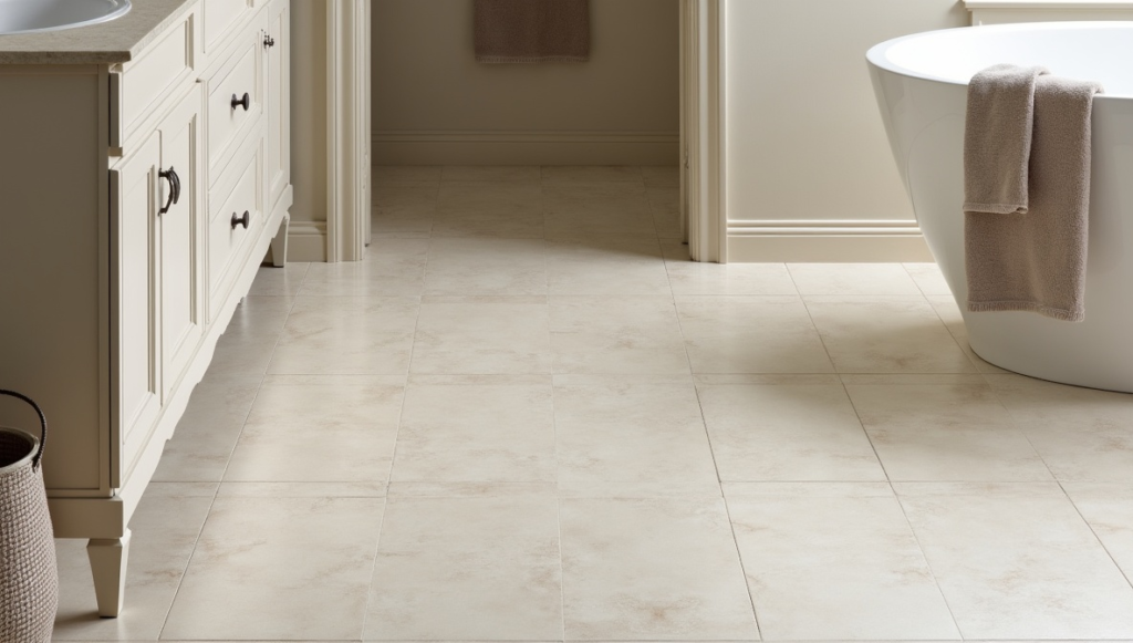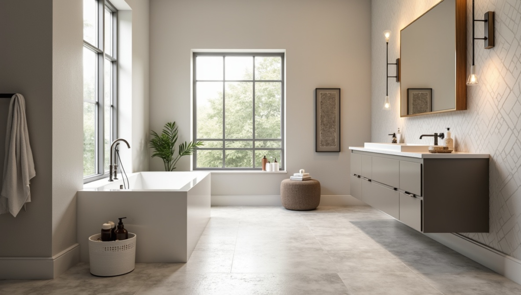 Timeless bathroom flooring focuses on longevity, elegance, and simplicity. Classic materials such as marble-look porcelain, neutral ceramic tiles, or natural stone ensure your space stays stylish for years. Patterns are minimal, and colors are soft and muted, creating a versatile foundation for any decor updates. Timeless floors blend seamlessly with various bathroom styles, from modern minimalism to subtle traditional touches. They provide a stable, elegant canvas that keeps your bathroom feeling fresh, sophisticated, and practical over time, making them a smart long-term design choice.