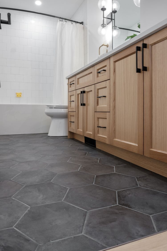 Chic bathroom floors focus on style, elegance, and modern design. Coordinated colors, polished finishes, and subtle patterns create visual interest without overcrowding the space. Chic floors work well with minimalist fixtures, neutral walls, and thoughtful lighting, maintaining balance and sophistication. This design adds personality to the bathroom while keeping the overall aesthetic clean and cohesive. Perfect for contemporary or transitional bathrooms, chic flooring combines visual appeal with practicality, offering a polished, stylish foundation that enhances the entire space.
