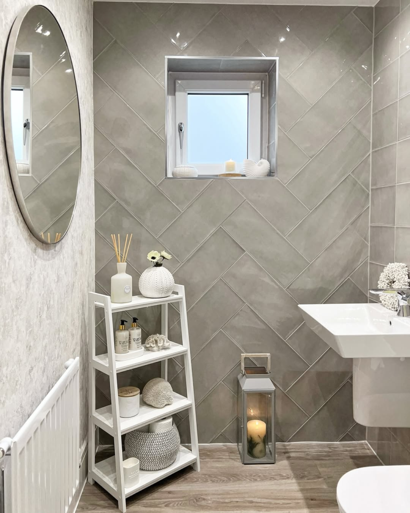 Recessed shelving becomes a quiet architectural feature with diagonal tiles framing a niche. Candles, neatly folded towels, and a few decorative pieces transform it into a mini gallery within the bathroom.