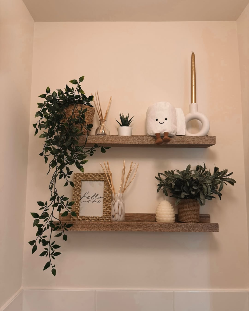 Two floating shelves against a cream wall demonstrate minimalism with warmth. Greenery, soft ceramics, and subtle gold accents create interest without clutter.
