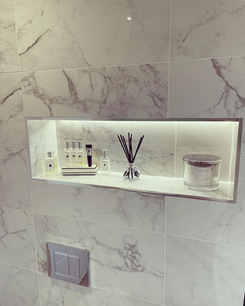 A recessed niche against a marble backdrop exudes understated luxury. A few glass bottles, a diffuser, or minimal décor is enough to elevate the space when the materials are high-end.