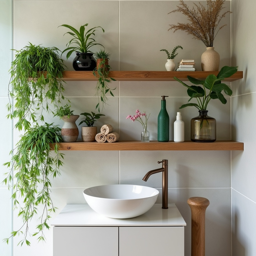 Floating wood shelves paired with trailing plants and sculptural vases create dynamic movement. Greenery spilling over the edges introduces an organic rhythm, softening the structured tiles behind.
