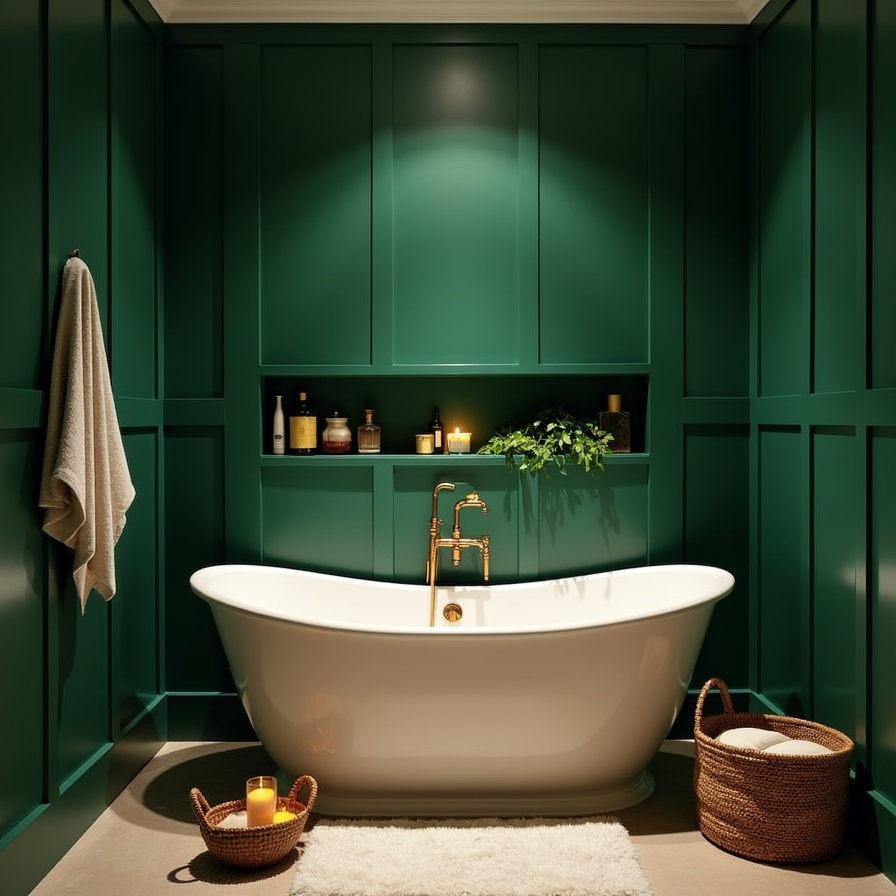 Deep green paneling behind a freestanding tub creates a bold focal point. A built-in ledge shelf across the wall holds minimal items—bottles, greenery—while soft lighting enhances the mood.