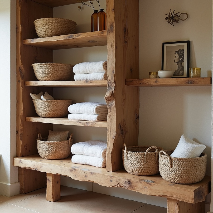 Chunky wood shelves with visible grain and thickness provide instant character. Neutral towels, amber bottles, and woven baskets introduce softness and balance.