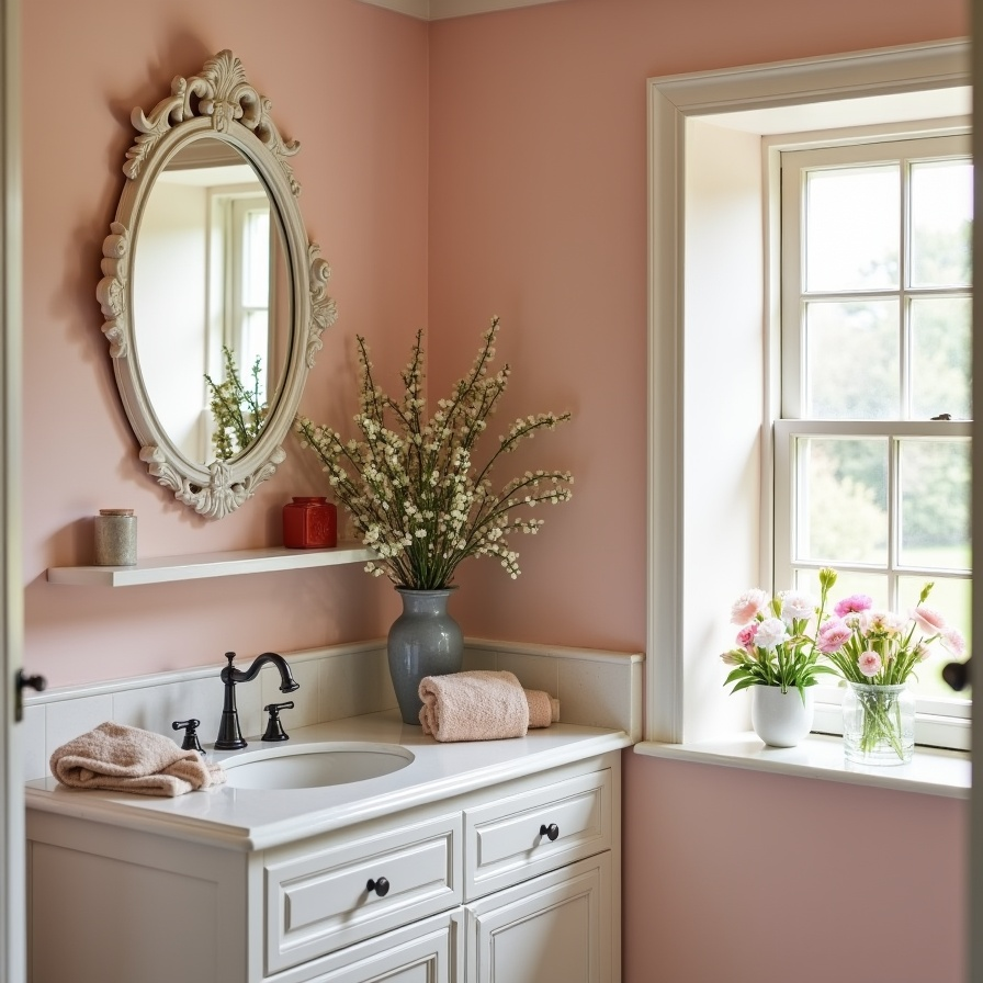 Soft blush tones, floral accents, and an ornate oval mirror create a warm, collected atmosphere. A carved shelf above the sink adds charm reminiscent of countryside guest rooms.