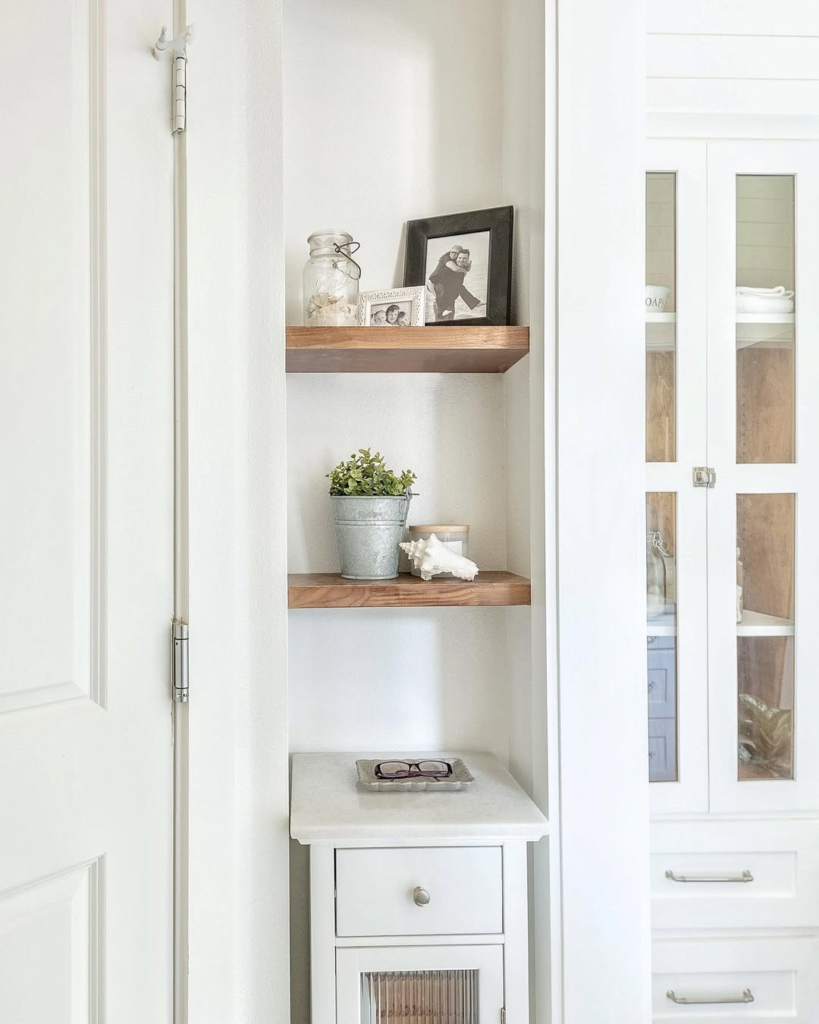 Even a narrow wall can become a focal point with floating wooden shelves. Personal touches like framed photos, greenery, and a small metal bucket add charm and storytelling.
