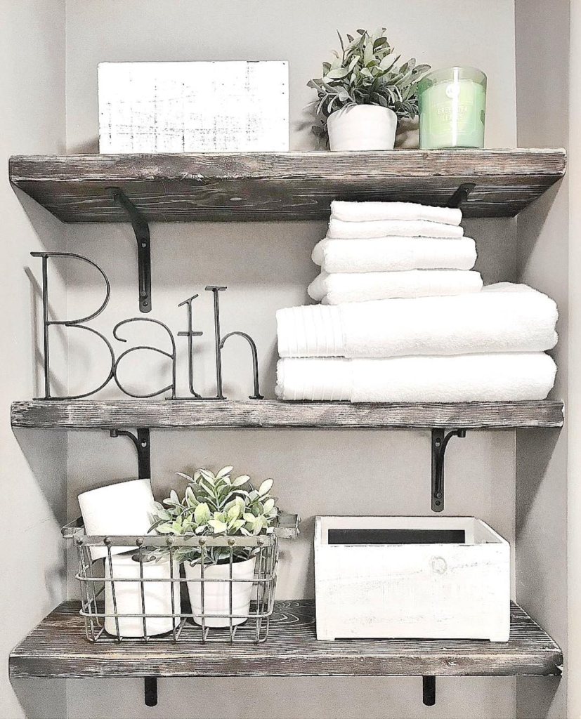 Thick wooden planks with black brackets provide a rustic touch while white towels maintain a fresh, clean aesthetic. Simple lettering or small decorative items add subtle charm.