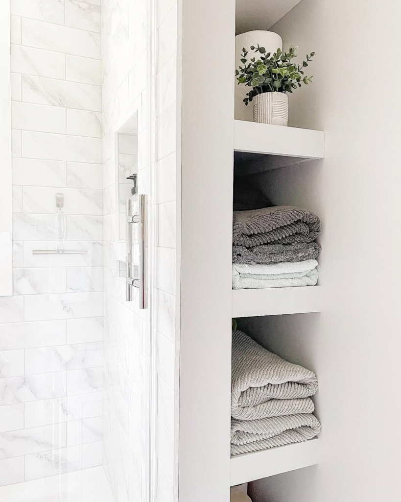 A recessed white shelf integrated into a neutral wall offers subtle elegance. Textured towels and small potted greenery add depth and visual interest without overcrowding the space.