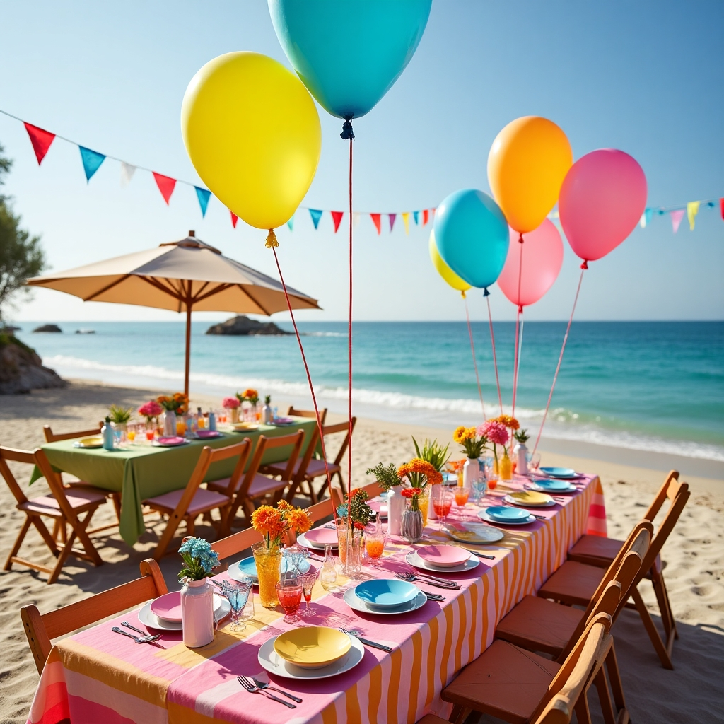 A delightful beach party emphasizes bright colors, charming details, and a visually appealing layout. Fresh flowers, colorful decorations, and coordinated seating arrangements make the event inviting.