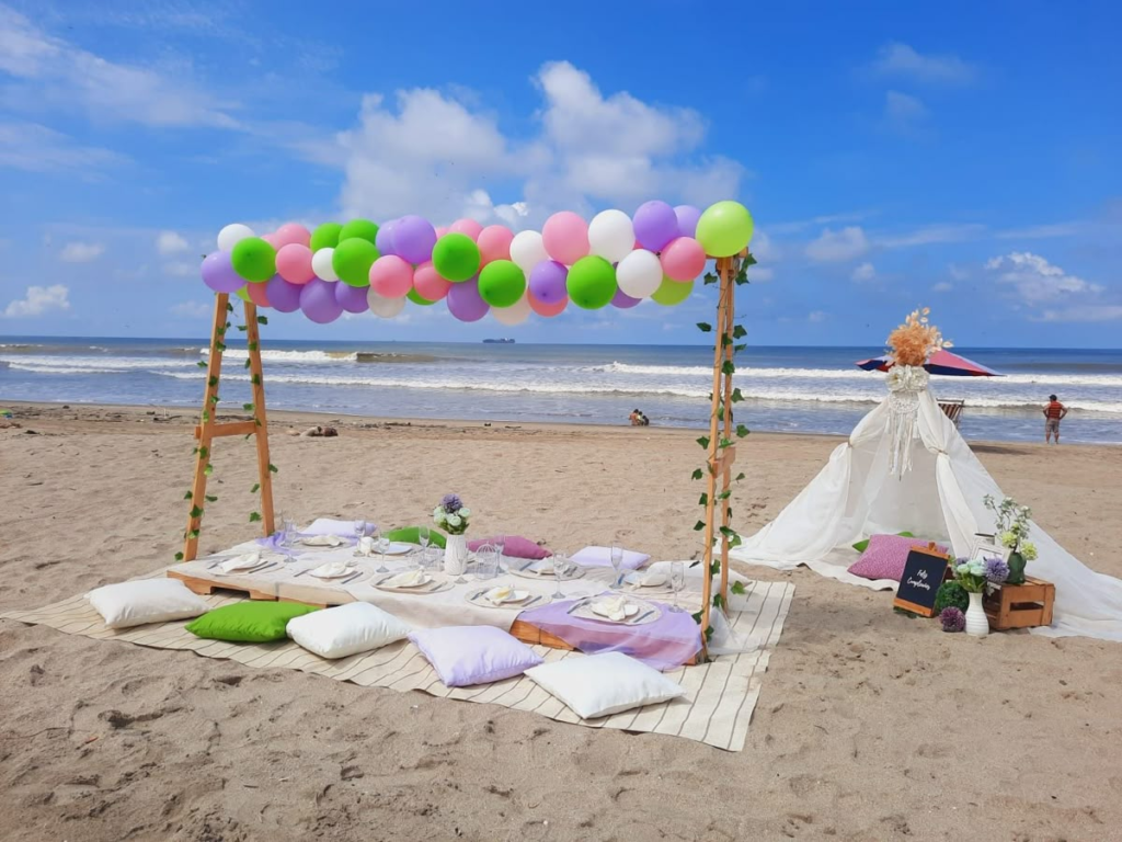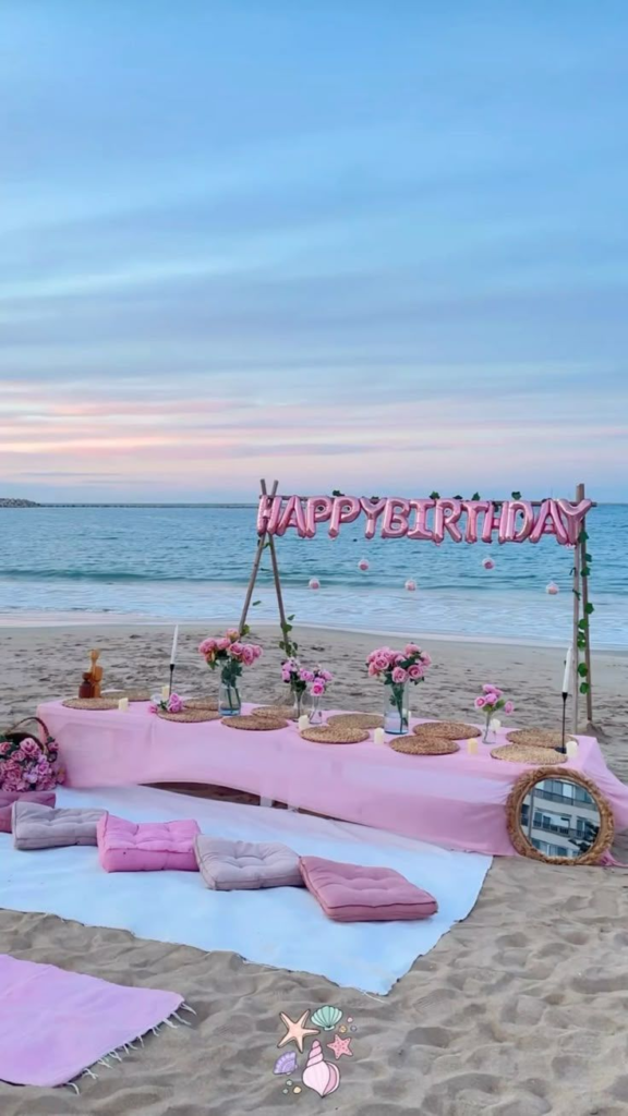 A lovely beach party emphasizes charm, beauty, and creativity. It’s ideal for hosts who want their setup to feel fresh, chic, and visually appealing. Think floral arrangements, pastel balloons, and elegant table décor.