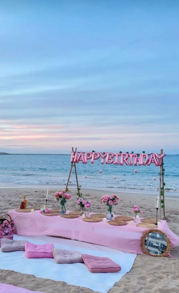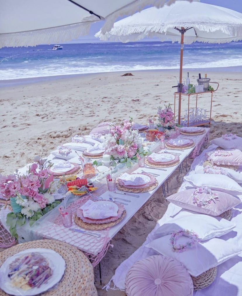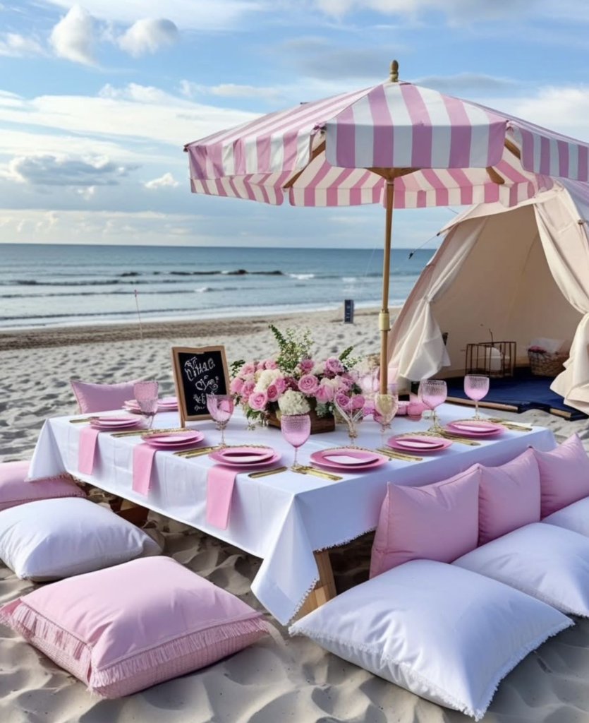 Pink elements stand out beautifully against the natural backdrop of sand and sea. Pairing soft pastels with deeper pink tones adds dimension, and incorporating gold or white accents elevates the overall look. A chic pink beach party is playful, stylish, and visually striking, perfect for making a memorable statement.