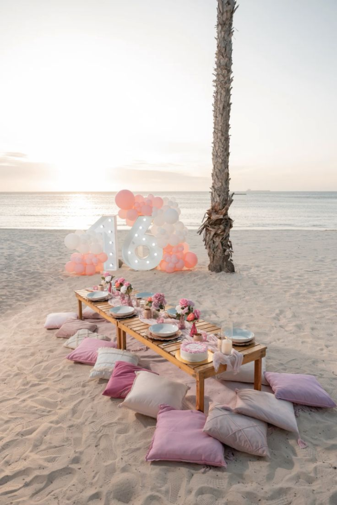 For those who love sparkle and sophistication, a glamorous beach party elevates the traditional celebration. Think chic décor, gold accents, and stylish tableware. Elegant lanterns, shimmered banners, and coordinated floral arrangements give a luxurious feel.