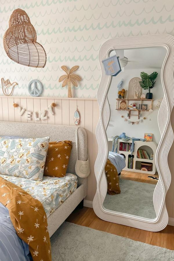 Natural wood mirrors with wavy edges are a simple way to introduce movement and charm to a bedroom. These mirrors reflect light, making spaces feel brighter and more open, while their playful curves echo the fluidity of ocean waves. When paired with soft coastal hues like sandy beige, seafoam green, or powder blue, they instantly evoke seaside serenity. Adding textures such as rattan light fixtures, driftwood-inspired furniture, or woven baskets complements the look, giving the room a relaxed yet stylish beach aesthetic. Wavy mirrors are both functional and decorative, making them perfect for any coastal-inspired interior.
