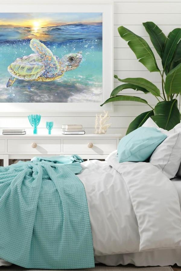 Vibrant sea turtle paintings create a captivating centerpiece in a bedroom. Rich turquoise, coral, and soft sandy tones mimic the ocean and draw attention to the wall without overwhelming the space. Placing artwork above the bed or opposite a window enhances the feeling of openness while creating a soothing focal point. Pairing the painting with textured throws, soft linens, or natural fiber rugs reinforces a coastal-inspired atmosphere. Adding plants with tropical or leafy green foliage further emphasizes the oceanic vibe. Such artwork not only decorates the room but also connects the interior with nature, offering a relaxing, beachside retreat at home.