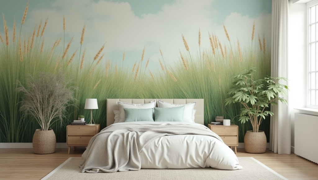 Wallpaper featuring tall, swaying sea grass instantly evokes the feeling of sleeping among dunes. Soft green and neutral tones mimic nature, bringing outdoor serenity indoors without clutter. This design pairs well with light bedding, subtle pastels, or natural linens to maintain a relaxed, airy environment. Layering textures such as soft throws, pillows, or woven rugs adds depth while keeping the aesthetic cohesive. Peel-and-stick wallpaper or large wall decals provide an easy, renter-friendly option for incorporating this look. Sea grass wallpaper transforms a bedroom into a peaceful coastal retreat, evoking nature and calm with minimal effort.