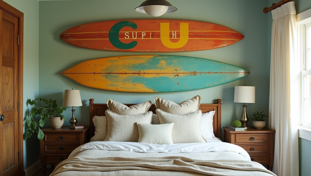 Decorative surfboards mounted on the wall bring instant beach energy to any bedroom. A mix of bold patterns and neutral designs creates visual contrast and reinforces a seaside theme without overcrowding the space. Using vintage boards or replicas adds authenticity and serves as a fun focal point above the bed. Natural wood headboards, neutral bedding, or soft blue accents complement the boards while maintaining balance in the design. Surfboard wall art is a simple, creative way to infuse personality and coastal charm, providing a playful nod to surf culture while maintaining an elegant beach-inspired style.