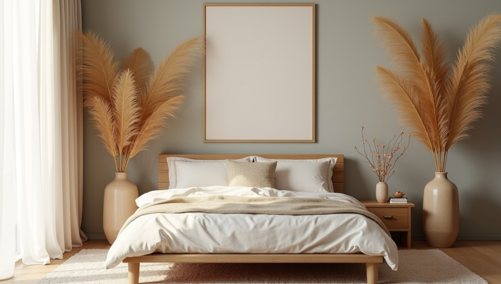 Dried palm fronds bring authentic, natural coastal charm to a bedroom. Their golden-tan hues complement neutral bedding, soft linens, and light wooden accents, adding warmth and texture. They can be placed in vases, arranged as wall art, or leaned against a corner for a low-maintenance decor solution. Affordable and widely available, dried fronds create a tropical atmosphere without overwhelming the space. Paired with subtle patterns or muted color palettes, they enhance the overall beach-inspired aesthetic. This small addition effortlessly connects indoor spaces with nature, making any room feel like a relaxing coastal retreat.