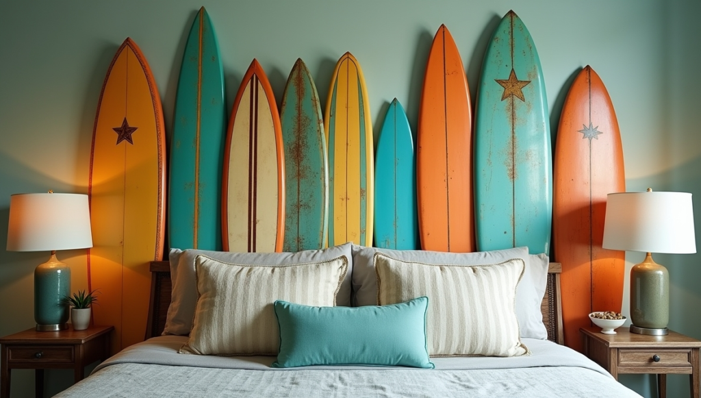 Weathered surfboards arranged behind a bed make for an imaginative and stylish headboard alternative. Using boards in varied colors, patterns, and finishes creates visual interest while reflecting classic surf culture. Complementing the arrangement with neutral bedding, striped pillows, and soft ocean-inspired hues keeps the space balanced. Vintage or thrifted boards are affordable ways to achieve this look, while modern replicas offer convenience. Surfboard headboards combine functionality with coastal charm, instantly elevating the room’s style and infusing it with personality reminiscent of a beachside retreat.