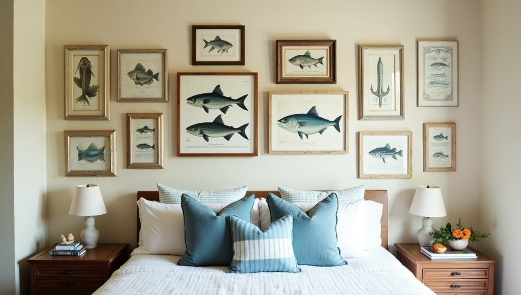 Framed illustrations of fish or other sea life add character to bedroom walls while reinforcing a maritime theme. Using a variety of sizes, orientations, and frame styles creates a curated, gallery-like effect that is visually engaging. Soft beige or neutral wall colors provide the perfect backdrop for these prints, ensuring they stand out. Complementary elements like striped pillows, driftwood accents, or small nautical décor pieces enhance the coastal narrative. Vintage fish prints offer an affordable, stylish way to bring personality and charm to a beach-inspired bedroom while maintaining a cohesive seaside aesthetic.