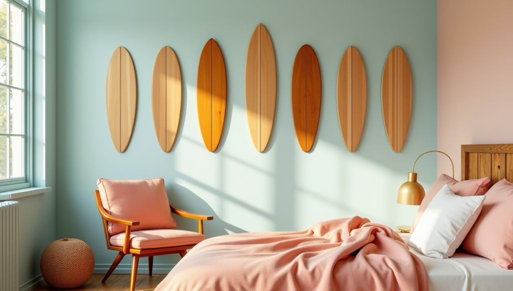 Small wooden surfboards or skateboard-style wall art introduce a playful yet sophisticated beach element. Their warm wood tones blend seamlessly with neutral walls, soft textiles, and subtle color accents. These decorative pieces highlight coastal personality without overwhelming the design, offering a relaxed, curated aesthetic. Integrating them with furniture and bedding in complementary shades keeps the look cohesive. Mini surfboard décor proves that even modest pieces can have a strong stylistic impact, creating a layered, thoughtful beach-inspired environment that feels inviting and visually balanced.