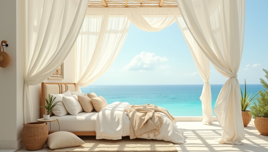 Sheer white canopies above a bed evoke the breezy, relaxed feel of a coastal cabana. Lightweight cotton or linen fabrics mimic the movement of ocean air, adding softness and visual interest. Layering textiles in cream, white, and natural tones enhances the serene, vacation-like vibe. Additional accents, such as tasseled pillows or woven baskets, build texture while keeping the room functional. This simple design element transforms a bedroom into a dreamy coastal retreat, combining elegance, comfort, and seaside inspiration in a single, accessible feature.