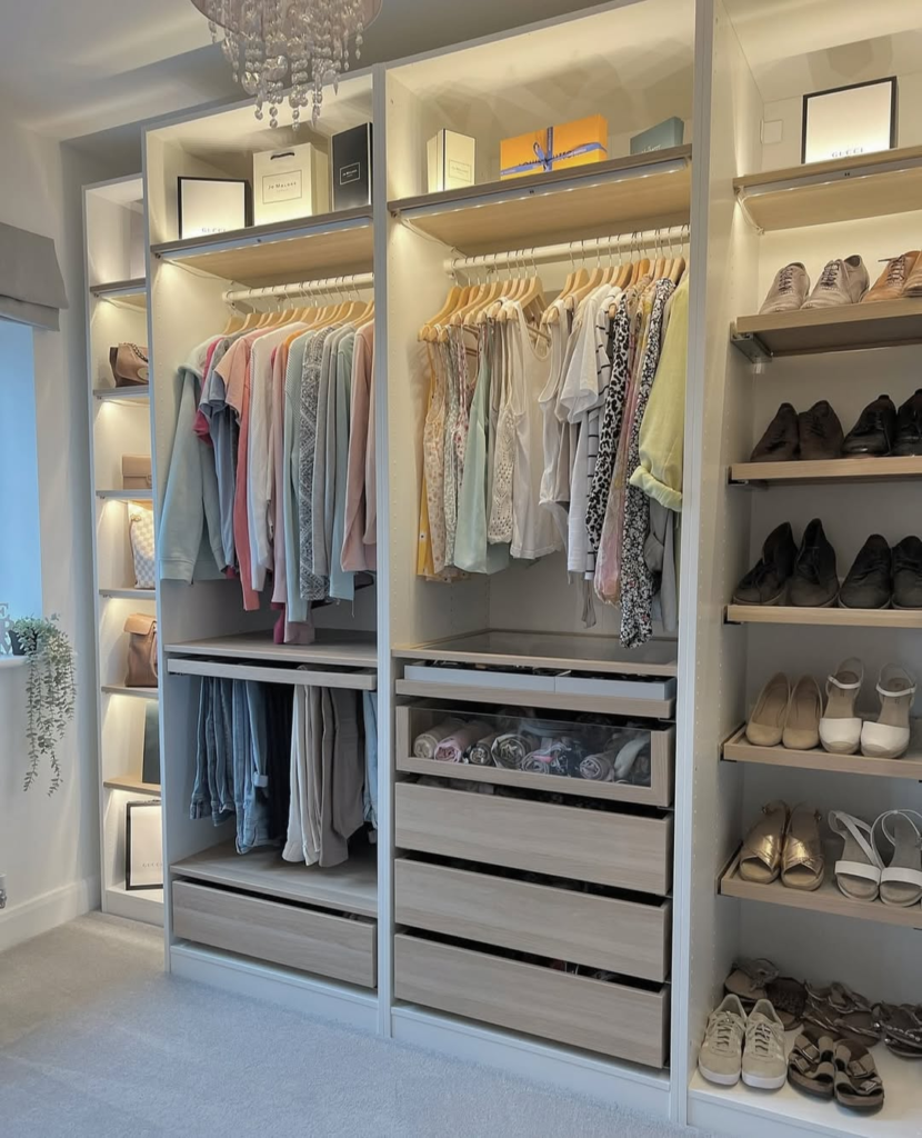 This wardrobe setup combines practicality with boutique-style elegance. Open shelving with soft LED lighting, glass-front cabinets, and neatly lined hangers create a bright, airy atmosphere without feeling crowded. Pale wood tones add warmth and maintain visual lightness, making it a joy to organise and access clothes. When everything is arranged intentionally, even daily routines feel elevated. It encourages thoughtful wardrobe management and adds a sense of calm order, turning a simple storage space into an inspiring, boutique-inspired corner of the home.