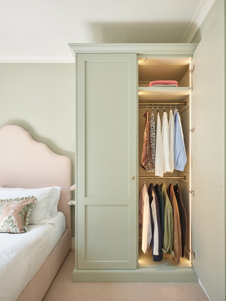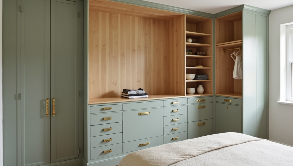 Muted sage cabinetry with warm oak interiors combines color, texture, and luxury subtly. Brass hardware adds refinement, while the contrast between exterior paint and natural wood interior enriches the visual experience. The design is classic yet modern, offering timeless appeal. It balances softness with structure, creating a space that is functional, beautiful, and quietly sophisticated. This approach proves that even subtle colors and natural finishes can create warmth, depth, and a sense of elegance within built-in wardrobe solutions.