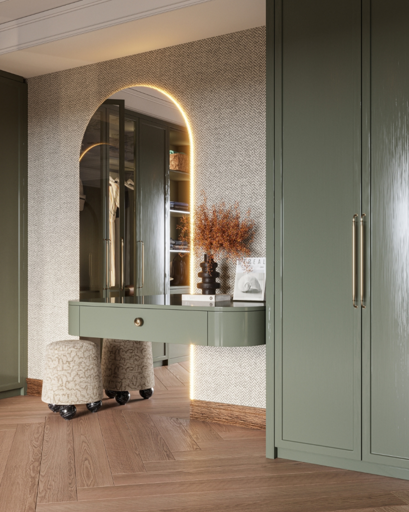 Here, storage meets design-forward drama. The built-in vanity with a glowing arched mirror commands attention, while olive-toned cabinetry provides depth and richness. This area blends practicality with cinematic style, giving the impression of a boutique dressing room within the bedroom. Shelves and drawers are both functional and visually appealing. The design encourages daily routines to feel intentional and enjoyable, transforming simple grooming tasks into moments of ritual and aesthetic pleasure. It demonstrates that wardrobe spaces can be as stylish as the rooms they inhabit.