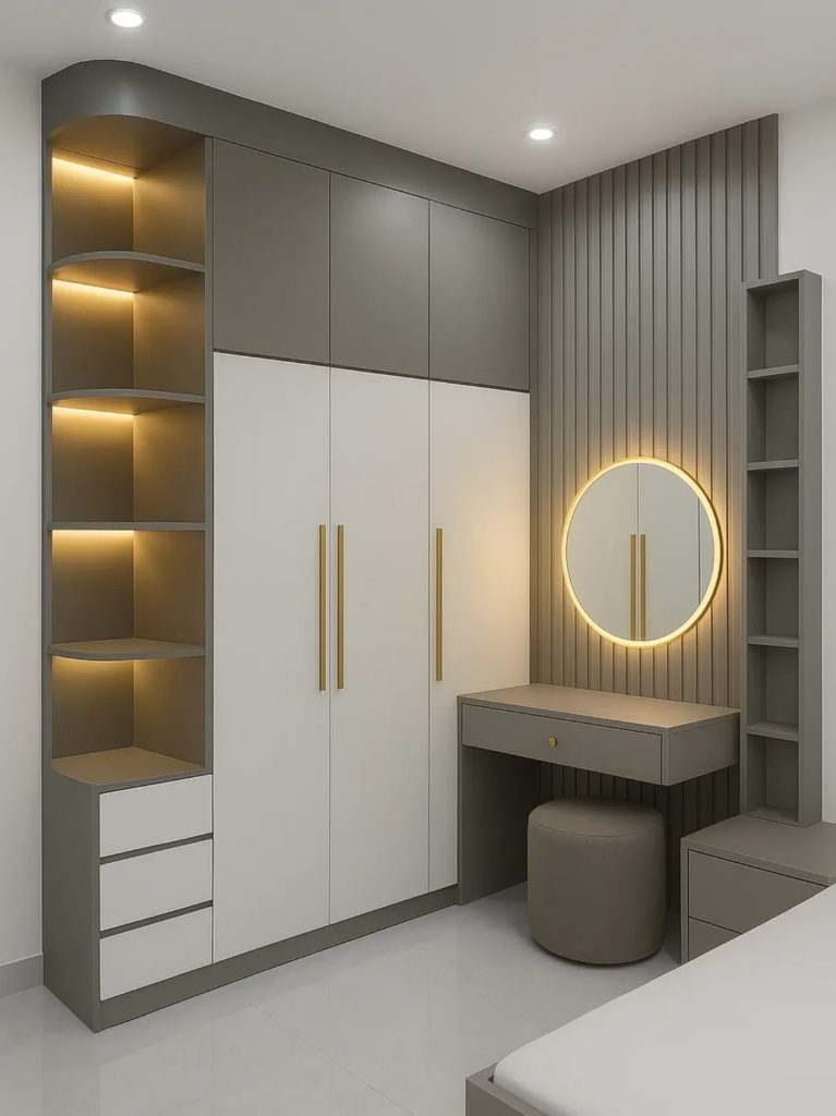 Soft grey and crisp white panels create a contemporary, visually interesting wardrobe. Vertical slats add texture, while a circular backlit mirror enhances both functionality and ambiance. The design emphasizes clean organization, intentionality, and visual balance. Every section is thoughtfully arranged, encouraging tidiness and maximizing storage without clutter. This combination of color, texture, and light demonstrates how modern built-ins can feel fresh and inviting, offering a wardrobe solution that is practical, elegant, and aesthetically pleasing while supporting everyday lifestyle needs.