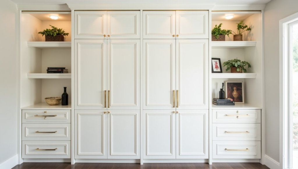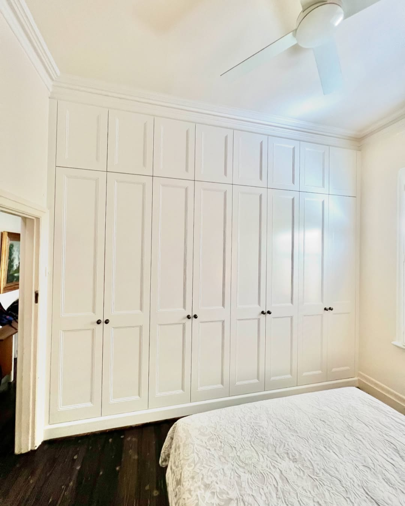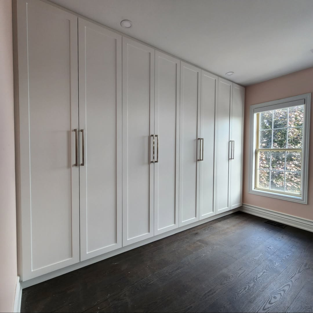 Wall-to-wall white cabinetry brightens the room and enhances a sense of space. Streamlined handles and minimal ornamentation maintain a fresh, modern aesthetic, while contrast with darker flooring and blush walls adds depth. The design is functional, practical, and versatile, allowing storage to blend seamlessly with overall decor. Its simplicity and adaptability make it a long-term solution, providing storage that remains stylish and approachable. This approach ensures that wardrobes can elevate a room’s design while offering accessible, organized functionality for everyday use.