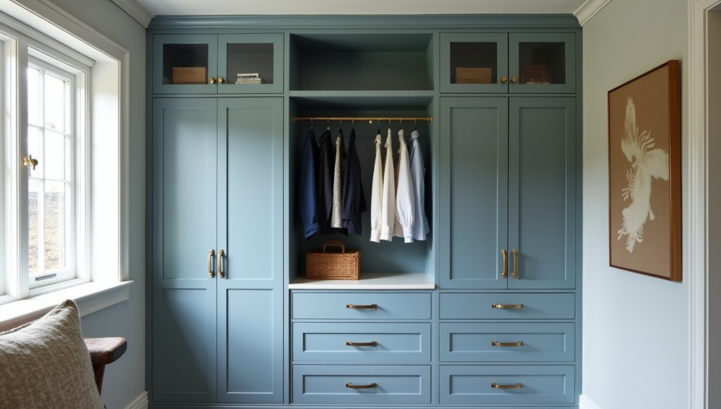 Dusty blue cabinetry adds personality and maturity, integrating drawers and upper cabinets for efficient storage. Placing it beside a window enhances natural light and emphasizes textures, creating a cozy, layered look. Every inch is used thoughtfully, maximizing functionality while maintaining design appeal. The result is a bespoke, cohesive storage solution that feels custom and intentional. This wardrobe demonstrates how color, placement, and craftsmanship can transform a functional feature into a signature element within a bedroom.