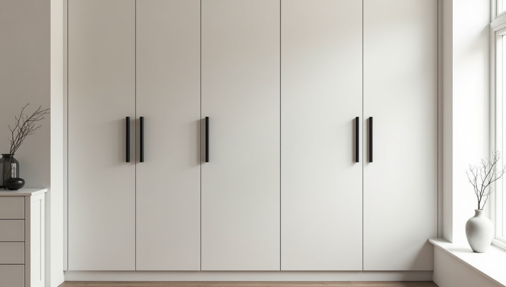 Soft neutral wardrobes with long black handles create a minimal yet striking aesthetic. The clean profile integrates seamlessly into the walls, providing organization without visual clutter. Paired with a simple vanity, the space feels intentional and serene, offering a sense of calm at the end of the day. This approach emphasizes understated elegance and practicality, demonstrating that minimal color palettes and thoughtful hardware choices can anchor a bedroom while keeping the atmosphere soothing, stylish, and uncluttered.