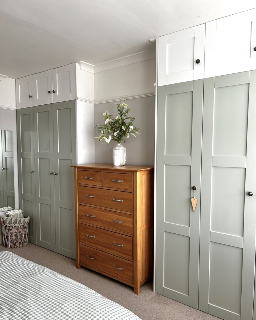 Sage and white cabinetry paired with warm wood elements creates a calming, cozy vibe. This design blends fitted and freestanding furniture to enhance personality and charm. The wardrobe feels like a natural extension of the room, offering storage while contributing to the overall aesthetic. Layered textures and complementary colors ensure the space is functional, welcoming, and slightly nostalgic. It proves that cottage-inspired wardrobes can be both practical and beautiful, elevating the bedroom without overwhelming the design and maintaining a sense of soft, lived-in comfort.