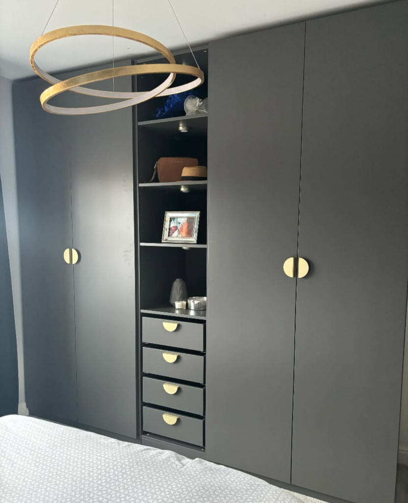 Matte dark panels with gold circular handles deliver a striking yet restrained look. Central open shelving breaks up the solid doors, providing a space for styling or decorative accents. The overall effect is grown-up glam without excess, balancing strong architectural lines with subtle metallic details. It demonstrates how minimalism can intersect with luxury, creating a wardrobe that is both elegant and functional. Every element feels purposeful, offering storage solutions that are visually impactful while maintaining sophistication and effortless style.