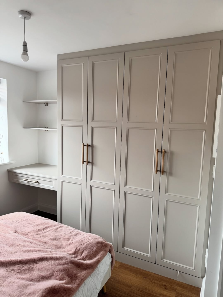Neutral tones, sleek brass handles, and clean lines define this modern fitted wardrobe. Integrated features, such as a desk nook, make every inch purposeful, perfect for small bedrooms where space is limited. The design emphasizes precision, leaving no gaps or wasted areas, and promotes a calm, organized environment. Subtle detailing and thoughtful finishes ensure the space is tailored yet approachable. This approach proves that contemporary wardrobes can be functional, elegant, and visually balanced, offering smart storage without compromising aesthetic appeal.