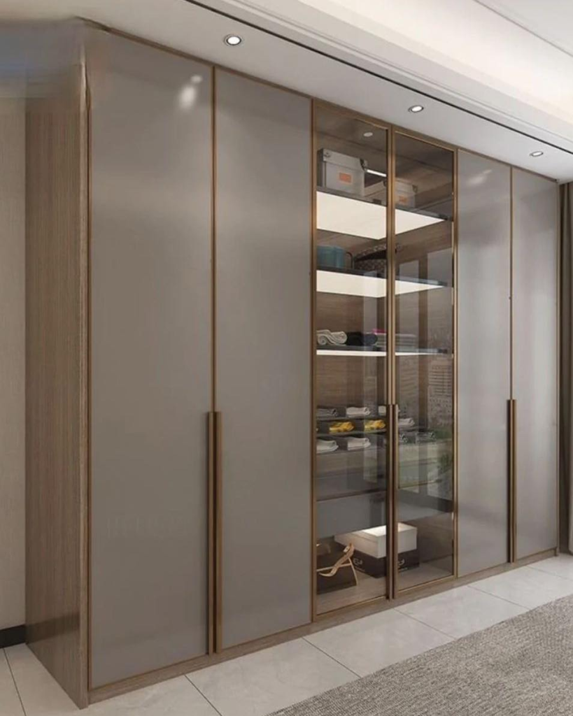 Matte grey panels paired with glass display sections and warm interior lighting create a sophisticated, modern look. Vertical lines maintain a sleek silhouette, while illuminated cubbies provide a subtle luxury-hotel feel. The design is understated on the exterior but thoughtfully curated inside, offering glimpses of organized clothing and accessories. This balance of mystery and intentionality gives the room a “main character” energy. It proves that built-in wardrobes can be simultaneously functional, stylish, and dramatic without overwhelming the surrounding space.