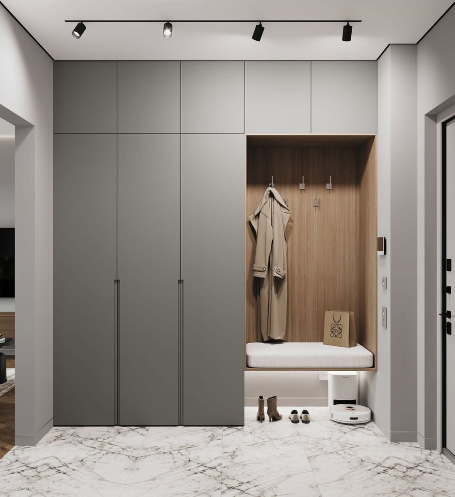 A wall-to-wall design with a niche, hooks, and bench creates a functional yet visually appealing entry area. Matte grey finishes keep the structure grounded, while marble flooring adds subtle luxury. The design is architectural, integrating seamlessly with the room while remaining practical. Every element feels intentional, transforming everyday routines—like hanging a coat or placing a bag—into thoughtful, enjoyable experiences. This approach illustrates that minimalism and functionality can coexist in wardrobes, creating spaces that are both stylish and organized.